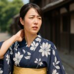 衣紋とは、首の後ろと浴衣の襟の間の隙間のことです。ここをこぶし一つ分ほどしっかり開ける(抜く)ことで、首筋から背中にかけての風の通り道ができ、熱気を逃がすことができます。ここは見た目の美しさだけでなく、涼しさのためにも重要なポイントです。